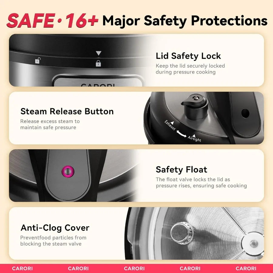 16+ Built-in Safety Features for Peace of Mind: Say goodbye to olla de presion worries! With over 16 advanced safety features, including a steam release button, lid safety lock, overheat protection, leak-proof design, and pressure limit protection, this pressure cooker electric is designed to prioritize your safety.