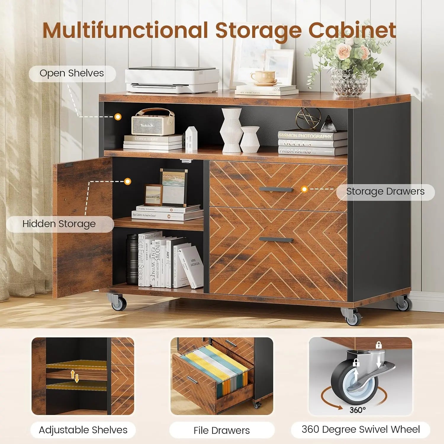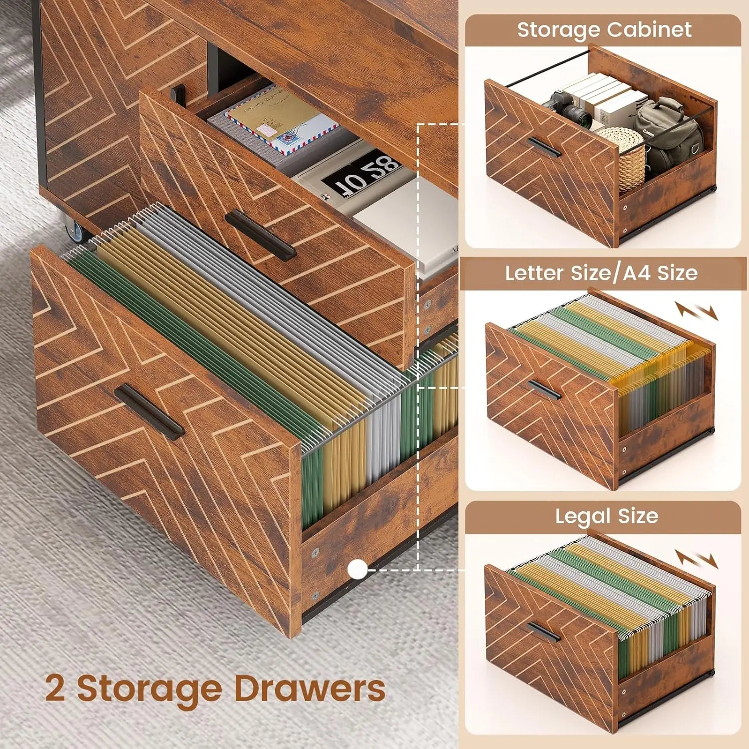 【Desk with Rolling File Cabinet】The 31.5” x 15.7” Rolling File Cabinet gives you more workspace and is perfect for placing a printer or scanner. The file drawer can hold letter/A4/legal files. The storage drawers and open shelves are perfect for storing other office supplies. There is large hidden storage space inside the cabinet door. This executive desk keeps your office organized.