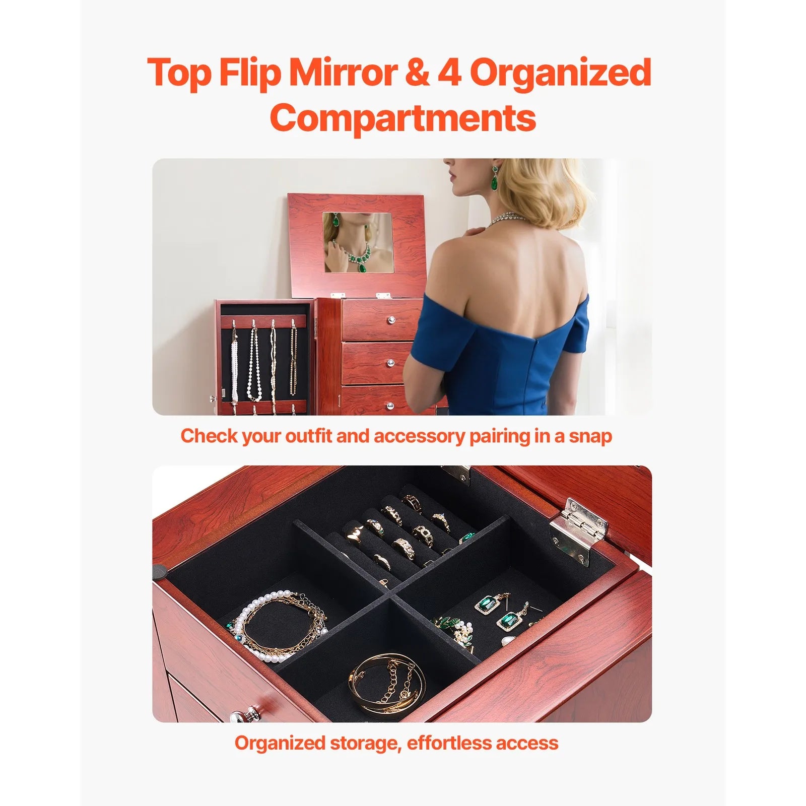Top Flip Mirror: The flip-open mirror and 4-compartment tray with ring slots provide instant visibility and easy access, making jewelry pairing effortless and elegant