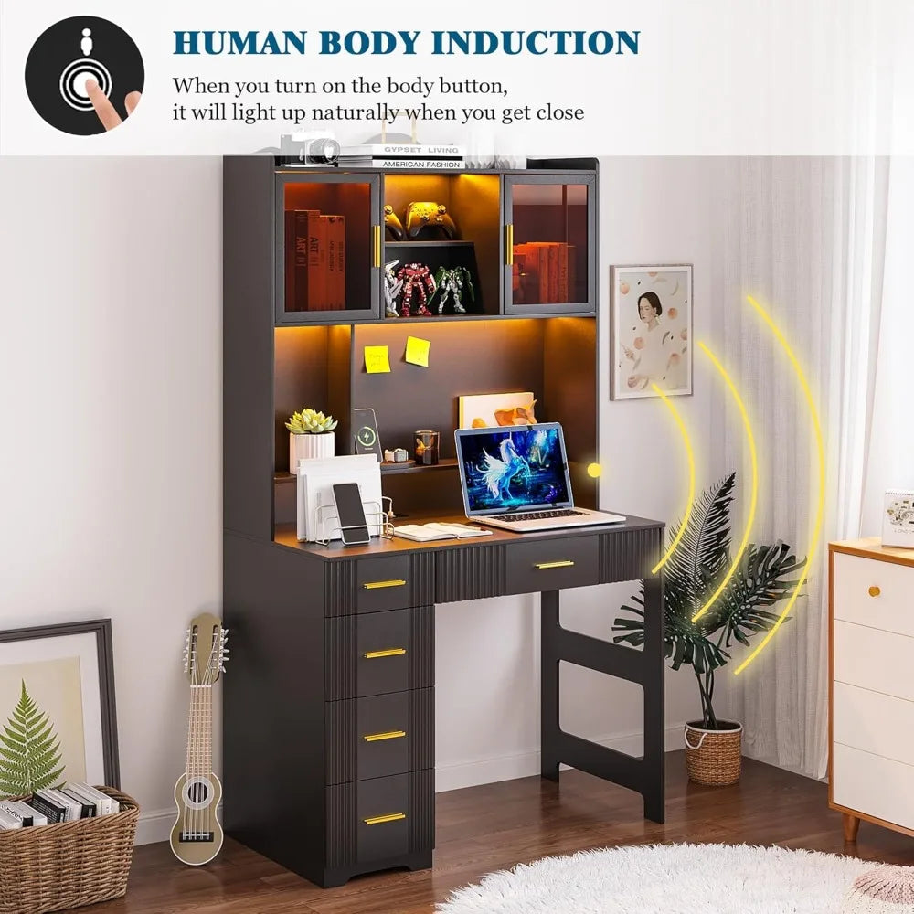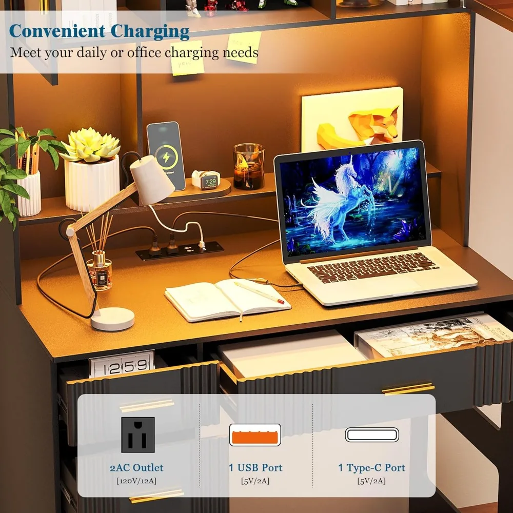 LED Study Desk with Hutch and Drawer, Home Office with Outlet,Computer Desk with Charging Station,Writing for Bedroo,Customized